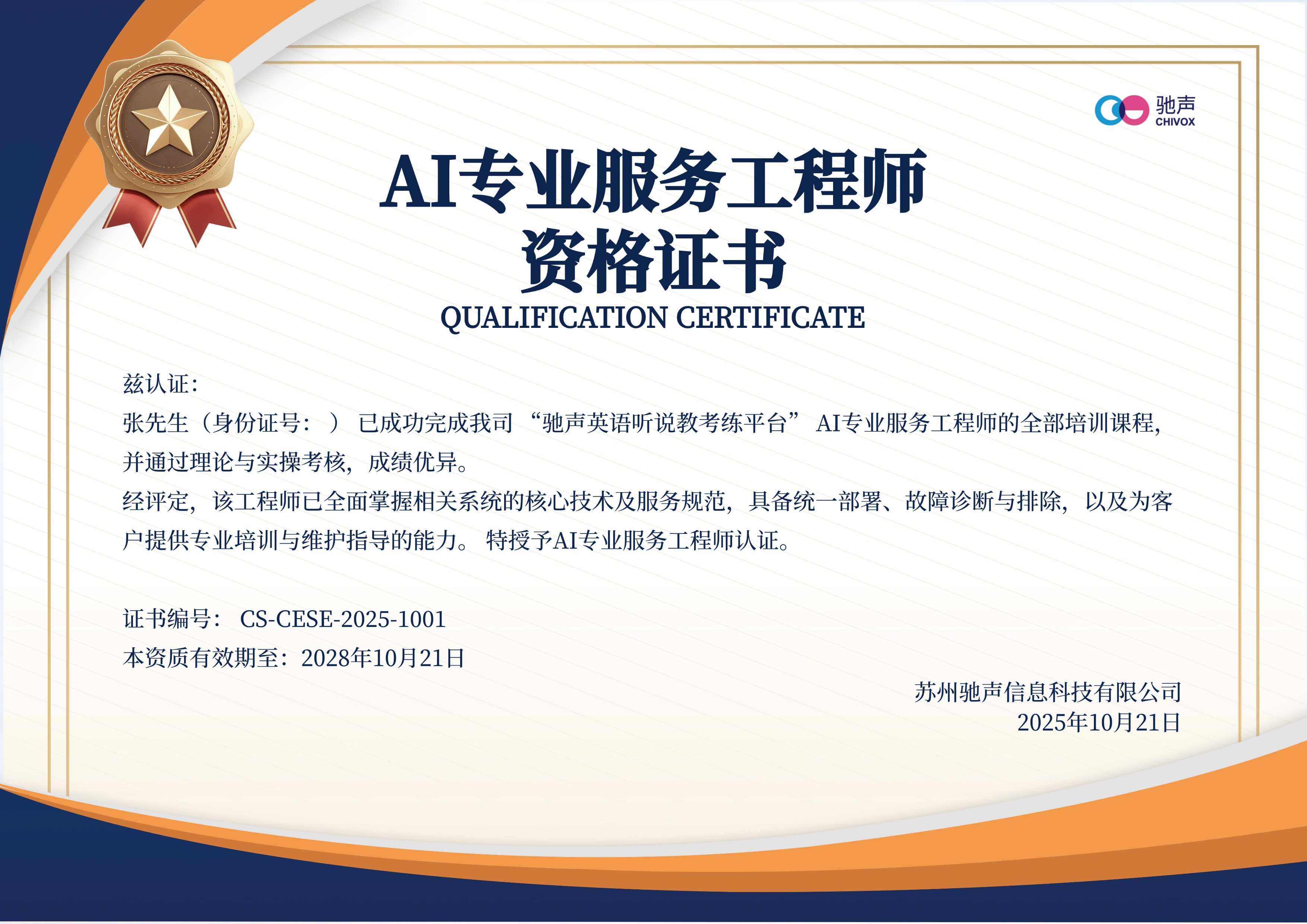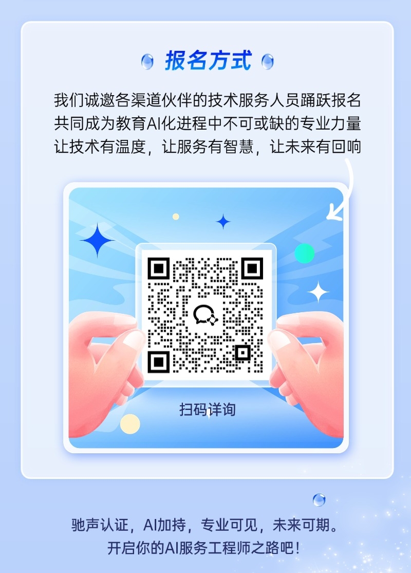 为进一步提升渠道伙伴的技术服务能力,驰声正式推出AI服务工程师认证体系,现全面启动首期报名!我们致力于通过系统化培训、实战化演练、持续化成长,助您成为“懂教育、懂技术、更懂AI”的信息化服务专家。