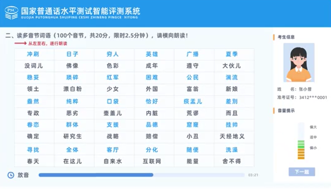 目前,全国绝大多数普通话测试站已全面采用计算机辅助测试模式。除“命题说话”由人工评阅之外,“读单音节字词”、“读多音节词语”、“朗读短文”三大题型均依托语音识别系统实现自动评分。