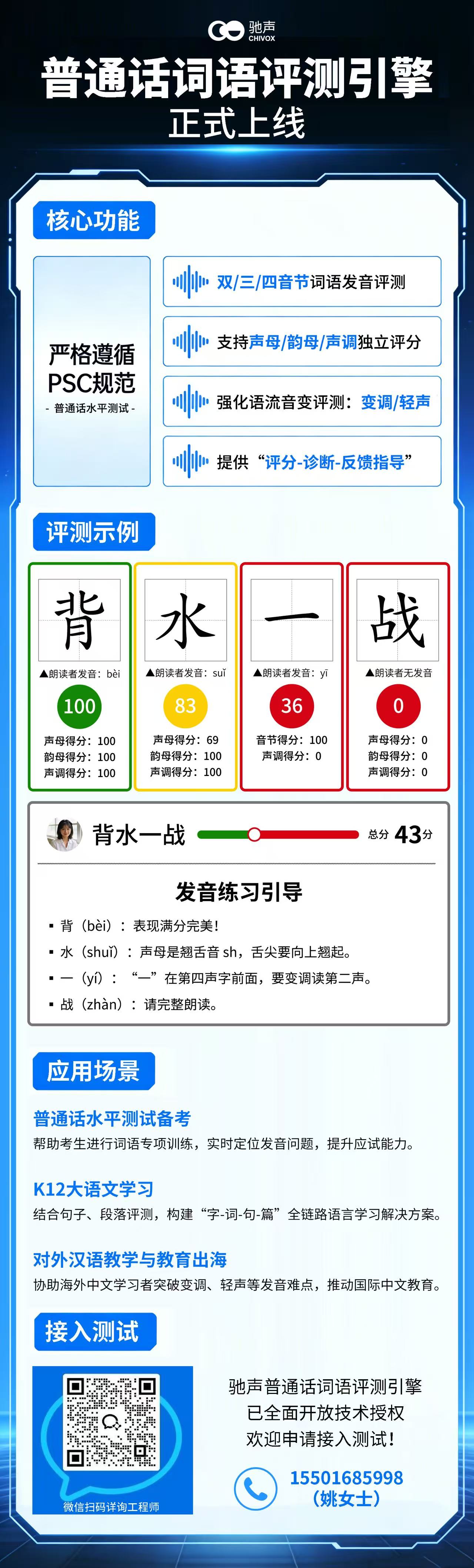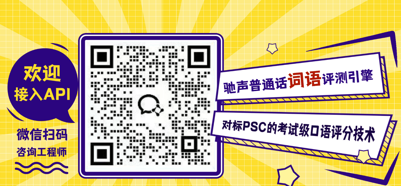 驰声语音评测API 技术授权咨询通道:15501685998(姚女士)