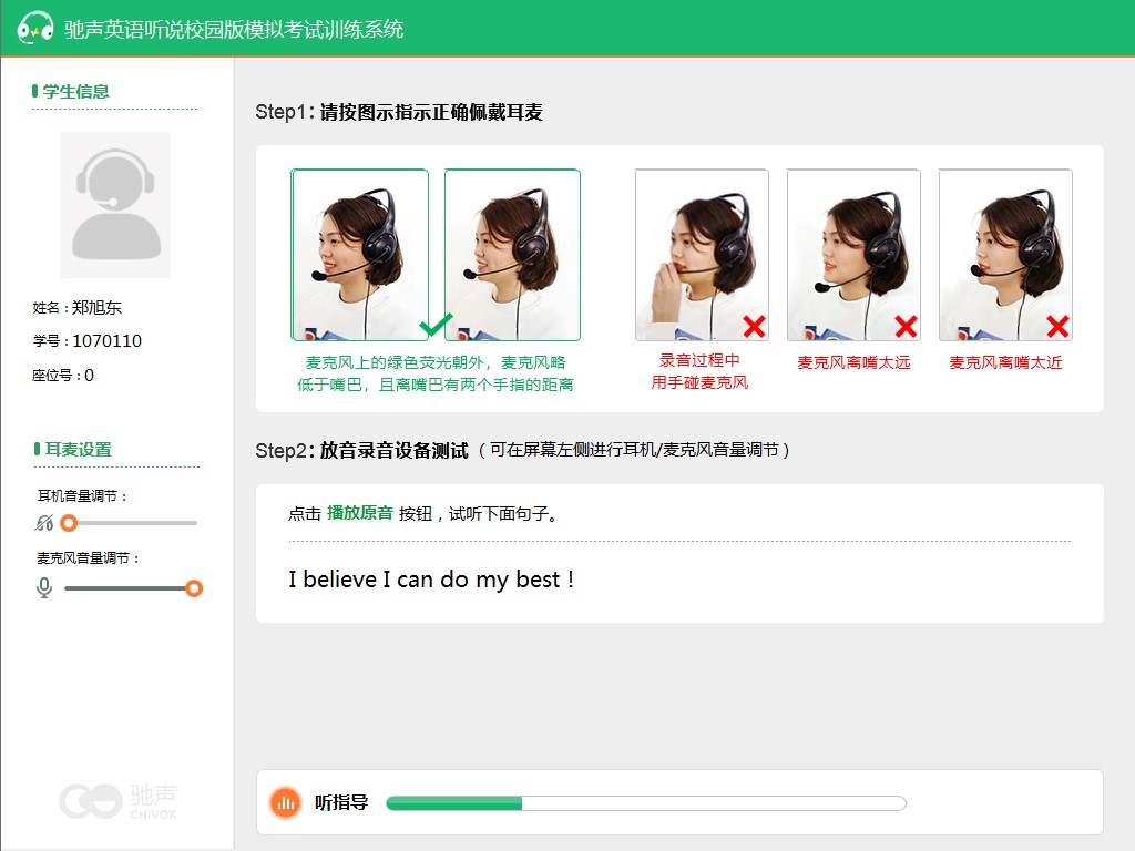英语听说校园版模拟考试训练系统在试音时,用的是:“I believe I can do my best”。